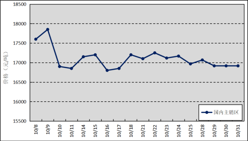 國內(nèi)主銷區(qū):10月,上海、青島和天津等銷區(qū)市場的國產(chǎn)全乳標準膠平均價格為17101元/噸,環(huán)比上漲1202元/噸,最高價為17850元/噸,最低價為16800元/噸。