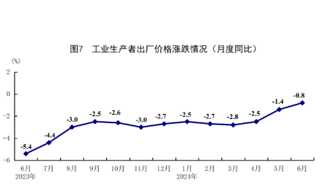 上半年,全國工業(yè)生產者出廠價格同比下降2.1%,降幅比一季度收窄0.6個百分點。其中,6月份同比下降0.8%,環(huán)比下降0.2%。上半年,工業(yè)生產者購進價格同比下降2.6%。其中,6月份同比下降0.5%,環(huán)比上漲0.1%。