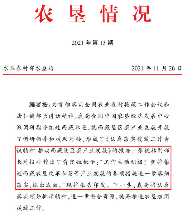 4.202110月,為貫徹落實全國農(nóng)業(yè)農(nóng)村援藏工作會議精神,經(jīng)濟貿(mào)易處牽頭組織調(diào)研組赴西藏開展專題調(diào)研。通過實地考察林芝市易貢茶場、察隅農(nóng)場等茶業(yè)種植區(qū),形成《認真落實援藏工作會議精神 推動西藏墾區(qū)茶產(chǎn)業(yè)發(fā)展》調(diào)研報告,獲得張?zhí)伊指辈块L肯定性批示。