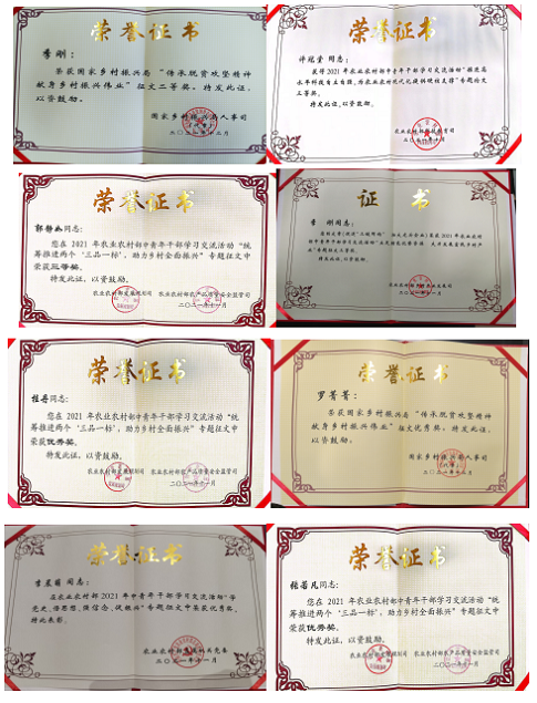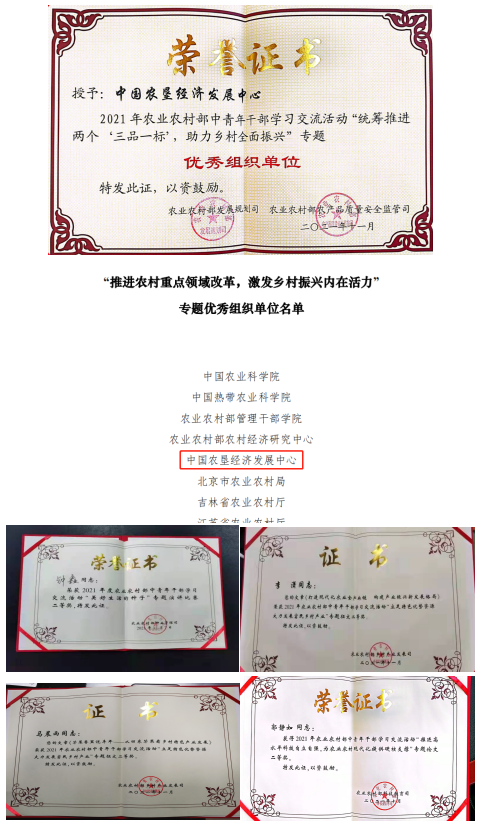 10. 在2021年農(nóng)業(yè)農(nóng)村部中青年干部交流論壇中,中國農(nóng)墾經(jīng)濟發(fā)展中心分獲專題二及專題三優(yōu)秀組織單位;青年同志累計投稿27篇,獲獎16其中,鐘鑫、桂丹、李瀟、馬晨雨、郭靜如、季剛獲得二等獎;許冠堂、郭靜如、季剛獲得三等獎;桂丹、羅菁菁、李晨萌、張若凡獲得優(yōu)秀獎;鐘鑫獲得專題七演講比賽二等獎。在永遠跟黨走農(nóng)業(yè)農(nóng)村部慶祝中國共產(chǎn)黨成立100周年職工書畫攝影展中,羅菁菁同志獲得攝影類三等獎