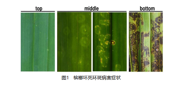當(dāng)前,海南定安、瓊海、萬寧、瓊中、陵水、保亭等主產(chǎn)區(qū)的檳榔正處于果實(shí)的采收期和新苗的定植期,果園內(nèi)溫度適宜、濕度適中,利于傳播檳榔壞死環(huán)斑病毒的刺吸式傳毒昆蟲的生長繁殖,易造成檳榔壞死環(huán)斑病害的大面積流行。該病害發(fā)病初期在新葉基部隱約可見褪綠環(huán)斑,逐漸在中部及底部葉片出現(xiàn)壞死環(huán)斑(見圖),直至葉片徹底壞死。發(fā)病檳榔的葉片稀疏、下垂或伴有黃化現(xiàn)象,嚴(yán)重影響檳榔長勢及果實(shí)產(chǎn)量。