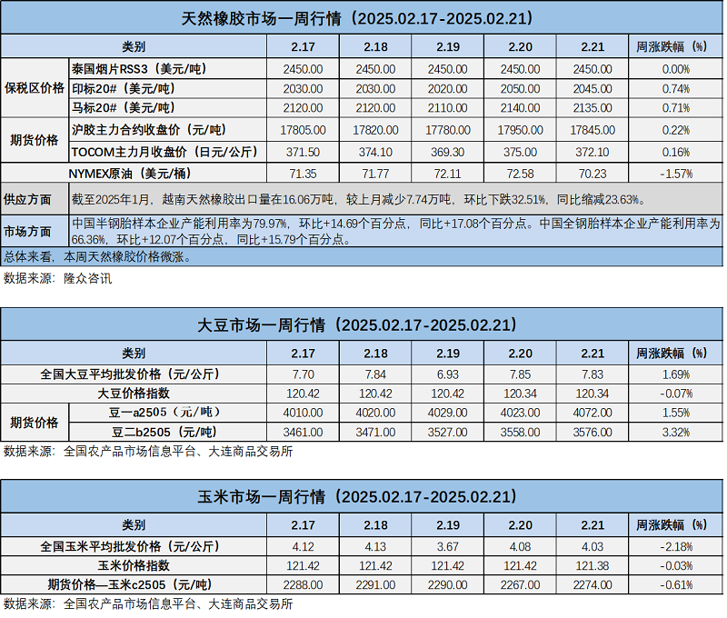 天然橡膠、大豆、玉米市場一周行情(2025.02.17-02.21)