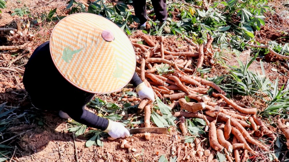 走進木薯種植地,只見一株株粗壯高大的木薯長勢喜人。工人們有的揮鋤采挖,有的砍枝去泥,有的裝袋搬運,忙得不亦樂乎。