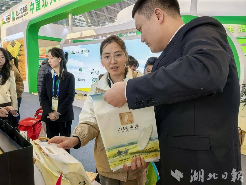 當(dāng)天,湖北展團(tuán)還帶來了NFC果汁、應(yīng)城黃灘醬油、隨州香菇、“楚小田”沙琪瑪、茶油紫蘇醬和潛江蝦稻等特色農(nóng)產(chǎn)品,均受到采購商和市民的追捧。