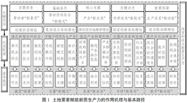 在創(chuàng)意階層理論、復(fù)雜適應(yīng)系統(tǒng)理論、演化經(jīng)濟(jì)地理學(xué)理論、國(guó)家創(chuàng)新系統(tǒng)理論、新熊彼特主義理論和適應(yīng)性治理理論等諸多理論的支撐下,土地要素及其配置制度能夠通過(guò)激發(fā)勞動(dòng)者群體“新素質(zhì)”,平衡傳統(tǒng)生產(chǎn)力和新質(zhì)生產(chǎn)力的要素組合模式,保障支撐產(chǎn)業(yè)轉(zhuǎn)型升級(jí),推動(dòng)原創(chuàng)性、顛覆性技術(shù)革新以及適配引導(dǎo)新質(zhì)生產(chǎn)力發(fā)展有效賦能新質(zhì)生產(chǎn)力發(fā)展。