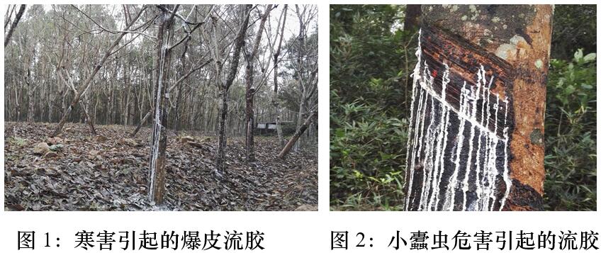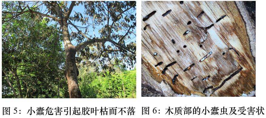 小蠹蟲危害后,其受害部位顯現(xiàn)流膠、針錐狀蛀孔、黃褐色木質(zhì)粉末,嚴(yán)重時莖干遍布蛀孔和粉柱、粉末等癥狀。鑒于寒害也會出現(xiàn)膠樹流膠,需注意區(qū)分寒害流膠與蟲害流膠。小蠹蟲危害的流膠部位主要分布于膠樹樹干開割部位及其上下30—50厘米范圍內(nèi),嚴(yán)重時才會分布在膠樹其他位置或者未開割膠樹,將膠線拉開,可看到小蠹蟲造成的圓形蛀孔,如果是新蛀的,則可看到水漬狀的圓形蛀點;寒害流膠的部位可分布于膠樹樹干任意位置,甚至是樹枝上,將膠線拉開,可以明顯看出流膠部位出現(xiàn)細(xì)小的裂縫或爆皮。