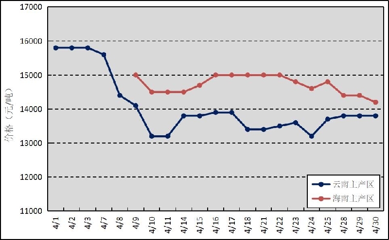 國(guó)內(nèi)主產(chǎn)區(qū):4月,國(guó)內(nèi)云南產(chǎn)區(qū)全面開割,海南產(chǎn)區(qū)和廣東產(chǎn)區(qū)月底開割。云南、海南鮮膠乳(折干膠)月均價(jià)格分別為14071元/噸、14713元/噸。