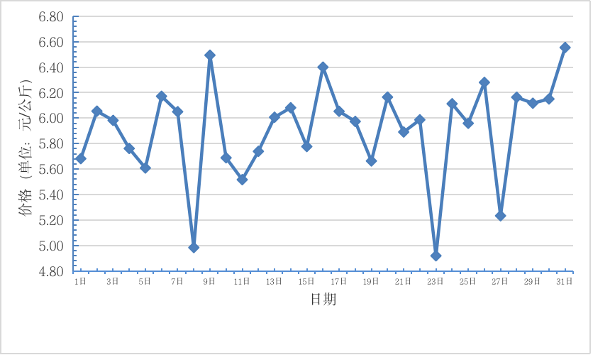 3月,全國重點監(jiān)測農(nóng)產(chǎn)品批發(fā)市場香蕉交易量 2.3萬噸、交易值 17619.3萬元。日平均價格最高為6.5元/千克,最低為5元/千克,全月平均價格為 5.9元/千克,同比上漲11.3%,環(huán)比下降9.2%(每日價格變化如圖)。