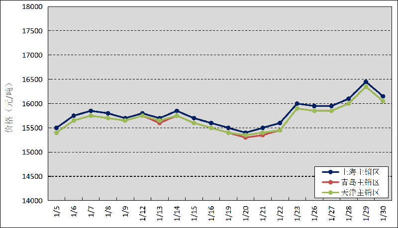 圖1 2026年1月國內(nèi)主銷區(qū)天然橡膠價(jià)格走勢