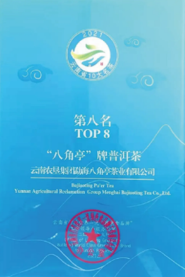 2021年,公司緊跟茶業(yè)集團(tuán)戰(zhàn)略部署,圍繞“改革創(chuàng)新”這一年度主題,深耕產(chǎn)品研發(fā)和市場(chǎng)推廣,“八角亭”牌普洱茶再次榮獲云南省“10大名茶”稱號(hào)。
