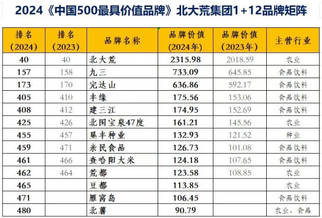 6月19日,由世界品牌實(shí)驗(yàn)室(World Brand Lab)主辦的2024 年(第二十一屆)世界品牌大會(huì)暨 2024年(第二十一屆)中國(guó)500最具價(jià)值品牌發(fā)布會(huì)在北京中國(guó)大飯店舉行,會(huì)上發(fā)布了2024年中國(guó)500最具價(jià)值品牌分析報(bào)告。北大荒農(nóng)墾集團(tuán)有限公司旗下的“北大荒”“九三”“完達(dá)山”“豐緣”“建三江”“北國(guó)寶泉47度”“墾豐種業(yè)”“親民食品”“查哈陽大米”“荒都”“豆都”“雁窩島”“北薯”13個(gè)品牌榮登中國(guó)500最具價(jià)值品牌排行榜。其中,“北大荒”品牌價(jià)值達(dá)2315.98億元,排名第40位,20年間,品牌價(jià)值增長(zhǎng)129.3倍,“豆都”“雁窩島”“北薯”3個(gè)品牌首次上榜。
