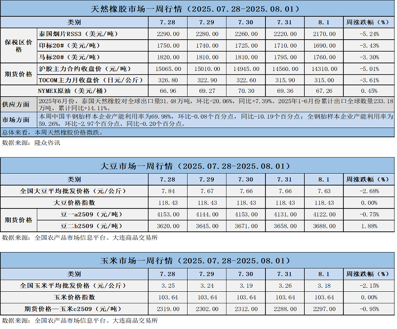 天然橡膠、大豆、玉米市場一周行情(2025.07.28-08.01)