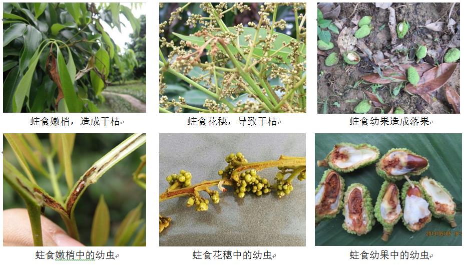 以幼蟲(chóng)蛀入嫩葉葉柄、嫩葉中脈、嫩梢、花梗、幼果、中果和大果為害,可導(dǎo)致嫩葉嫩梢及花穗干枯、幼果大量脫落;在大果上,幼蟲(chóng)則在果蒂與果核之間取食,留下黑褐色粉末狀的蟲(chóng)糞,俗稱“糞果”(圖2)。