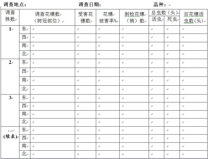 選擇當(dāng)?shù)赜写硇云贩N的果園1-3個(gè),按對(duì)角線選取5個(gè)樣點(diǎn),每點(diǎn)查5株,每株按東、西、南、北4個(gè)方位,每方位查上、中、下3個(gè)梢,觀察記錄被害花穗,并剪下被害花穗(圖3),將一部分被害花穗進(jìn)行剝檢,記錄活蟲(chóng)數(shù)、死蟲(chóng)數(shù),將所有數(shù)據(jù)記錄于表1中,以明確為害情況。