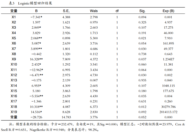 利用微觀調(diào)研數(shù)據(jù),從農(nóng)戶自身特征、家庭特征、割膠制度認(rèn)知特征、天然橡膠市場、基層組織環(huán)境角度的分析結(jié)果,對膠農(nóng)選擇割膠制度存在一定影響,本節(jié)從計量數(shù)學(xué)方法上分析民營膠農(nóng)選擇割膠制度的影響因素。二元Logistic模型是線性回歸逐漸發(fā)展的產(chǎn)物,當(dāng)被解釋變量、解釋變量中存在0/1二值品質(zhì)型變量時,一般線性回歸模型不能夠滿足回歸分析,繼而選擇二元Logistic回歸模型。本文以我國民營膠農(nóng)割膠制度選擇情況為因變量,影響膠農(nóng)割膠制度選擇的變量為自變量,二元Logistic模型適合本文研究。