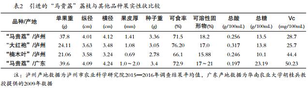 摘 要:“馬貴荔”荔枝是從廣東省高州市馬貴鎮(zhèn)選育出的特遲熟荔枝品種,2013年以高接換種方式引入四川省瀘州市江陽區(qū)黃艤鎮(zhèn)。引種4年后表現(xiàn)為適應瀘州地區(qū)氣候條件,枝條生長快速,易成花著果,成熟期8月中旬,比當?shù)刂髟缘摹按蠹t袍”荔枝和晚熟的“楠木葉”荔枝分別晚30d左右、7d左右。引進的“馬貴荔”荔枝果實性狀及品質(zhì)基本達到原產(chǎn)地水平,初步判定引種成功。