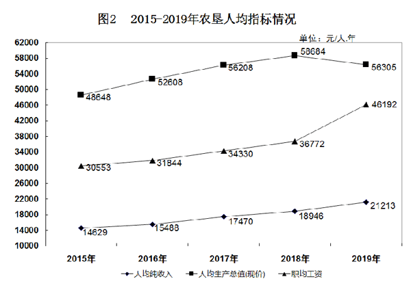 全年農(nóng)墾經(jīng)濟實現(xiàn)生產(chǎn)總值17886.25億元(見圖1)。其中,第一產(chǎn)業(yè)增加值1828.37億元;第二產(chǎn)業(yè)增加值3290.01億元;第三產(chǎn)業(yè)增加值2767.87億元。第一、第二、第三產(chǎn)業(yè)增加值占農(nóng)墾生產(chǎn)總值的比重分別為23.2%、41.7%和35.1%。人均生產(chǎn)總值56305元;人均可支配收入持續(xù)增長,達到21213元,比上年增長12%(見圖2)。